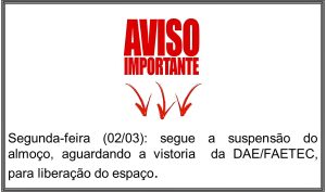 Pedimos aos alunos que se organizem, pois em função da necessidade de limpeza geral e higienização das instalações do espaço de alimentação, não serviremos almoço, só voltaremos a servir após liberação da DAE/FAETEC.
